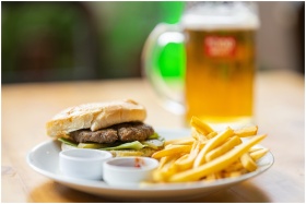Delicious cheeseburger with fries and a beer, perfect for a classic meal.