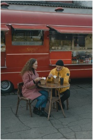 A couple enjoys takeout food at a table beside a red food truck outdoors.
