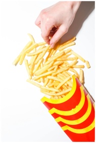 Close-up view of a hand picking up scattered french fries from vibrant red packaging on a white surface.