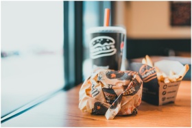 A wrapped burger, fries, and soda on a modern café