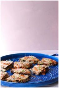 Slices of cut quesadilla with delicious filling topped with cheese and sauce served on round blue plate on table near wall