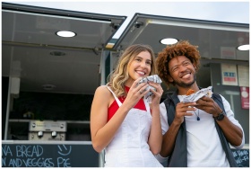 Delighted young multiracial friends wearing casual outfits enjoying delicious burgers and looking away with smiles while standing near street food truck