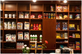 Wide array of packaged groceries neatly arranged on wooden shelves in a store setting.
