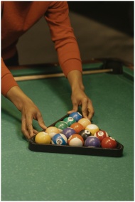 A close-up view of a person arranging billiard balls in a triangle on a pool table for a game.