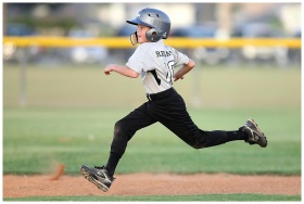 Action shot of a young baseball player running fas