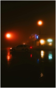 A moody, rain-soaked street scene at night with blurred lights and reflections.
