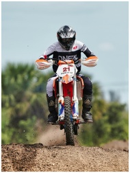 Exciting motocross race showcasing a biker jumping on a dirt track in Miami.