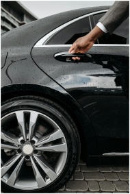 Close-up of a hand opening a black luxury car door on a rainy day. Elegant and modern design.