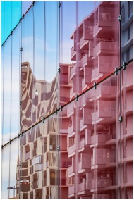 Reflection of geometric modern buildings in glass