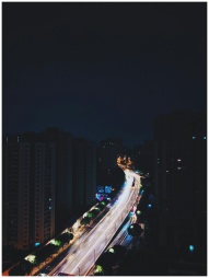 Aerial view of Guangzhou city at night showing light trails from traffic on a highway.