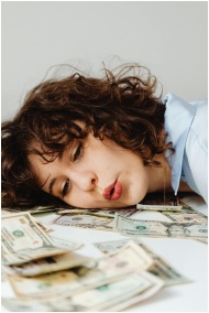 Close-up of a curly-haired woman resting on US dollar bills, conveying financial contemplation.