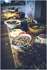 A vibrant buffet table with salads, dips, and skewers, perfect for dining occasions.