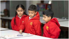 Three children wearing red uniforms engage in a classroom learning activity in Patiala, India.