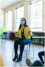 A teacher in a mask engaging students in a classro