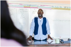 A teacher in a classroom with students, focusing o