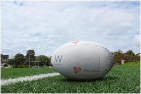 A detailed shot of a rugby ball on a green sports