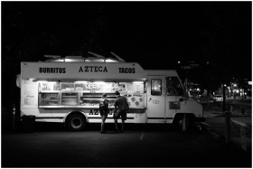 Black and white photo of people buying from a taco food truck at night.
