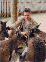 Full body of smiling content blond male in casual beige outfit patting and playing with cute kangaroos while sitting on log in zoo