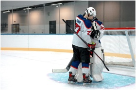Two ice hockey players hugging on the rink, symbol