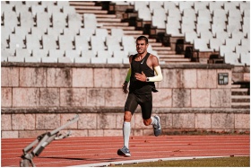 A determined male athlete runs on a track in a sunny stadium, showcasing endurance and speed.