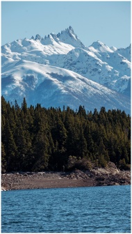 A stunning landscape with snow-capped mountains reflecting in a tranquil blue lake, bordered by lush evergreen forests.