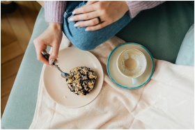 Overhead view of a cozy breakfast scene with a ber