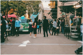 Busy street food scene in Mandau Talawang, Central Kalimantan, Indonesia at twilight.