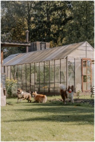 Three playful dogs enjoying a sunny day near a garden greenhouse. Perfect outdoor nature scene.