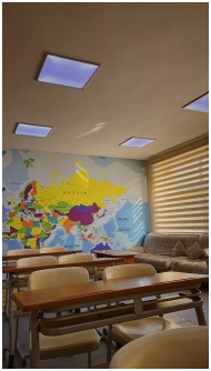 Colorful classroom with a world map wall mural and modern furnishings.