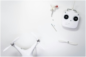 A flat lay of a drone kit including a controller a