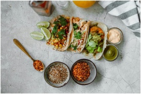 Top view of colorful Mexican tacos with limes, spices, and sauces, perfect for a culinary splash.