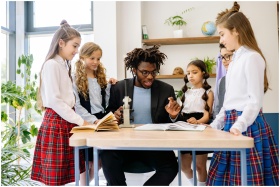 Teacher and diverse group of students in school setting, learning with books and microscope.