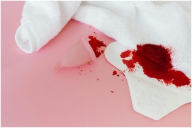 Menstrual cup and sanitary pad with blood stains on pink background, emphasizing menstrual hygiene.