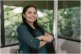 Portrait of a confident businesswoman standing with arms crossed in modern office space.