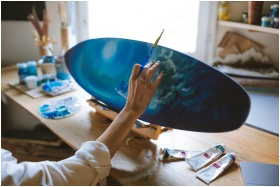 Close-up of an artist painting a surf-themed surfboard in a creative studio setting.
