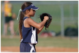 Young girl playing softball, preparing to pitch on
