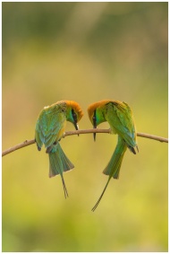 Two vibrant Asian green bee-eaters perched on a br
