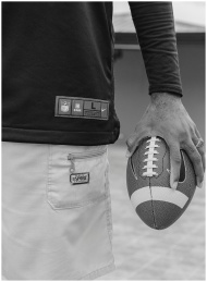 Monochrome photo of an individual holding a footba
