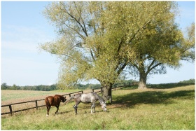 A serene countryside scene with horses grazing nea