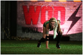 Fitness-inspired photo of a female athlete poised on a turf field indoors, ready for action.
