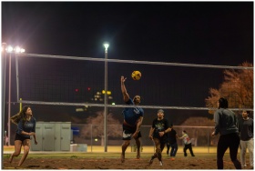 Amateur volleyball players enjoy a dynamic game under the lights in an Arizona park.