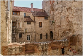 Ancient stone architecture with people in courtyard, capturing European historic vibes.