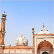 Elegant architectural capture of Jama Masjid's domes and minaret against a clear sky.