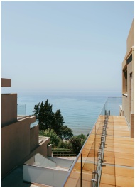 Contemporary building architecture with sea view in Agios Gordios, Greece, perfect for travel and luxury tourism imagery.