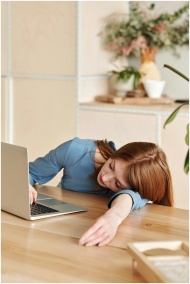 Woman in blue dress asleep on desk with laptop nea