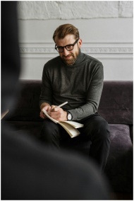 Male professional in a cozy office setting taking notes during a session or meeting.