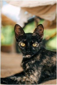 Detailed image of a tortoiseshell cat lying down with vibrant eyes and a blurred background.