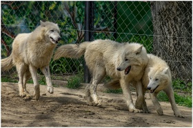 Three Arctic wolves frolic in a zoo enclosure, sho