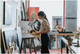 A woman artist works on a painting in a creative studio space filled with art and light.