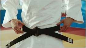 Close-up of a martial artist tying a black belt, s